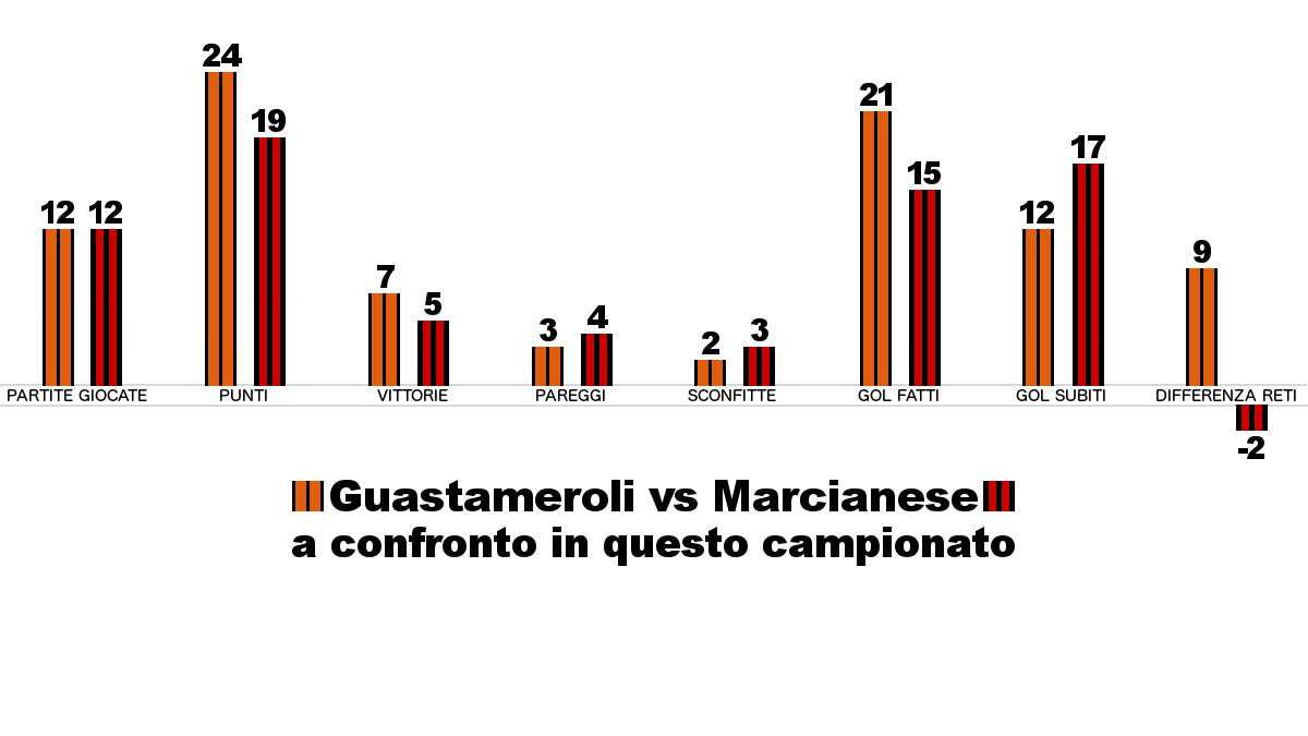 | A Guastameroli ultimo “derby” dell’andata con un Comune confinante (17 dicembre 2016) Mucciante di Pescara arbitra Guastameroli-Marcianese (16 dicembre 2016) Guastameroli e Marcianese con uno squalificato per parte (15 dicembre 2016) Guastameroli arruola Di Pendima e svincola Menno Di Bucchianico (15 dicembre 2016) Guastameroli avanti negli scontri diretti: con la Marcianese non è mai finita pari (15 dicembre 2016) Una folta colonia di ex rossoneri e spallini nel Guastameroli che domenica ospita la Marcianese (14 dicembre 2016) |