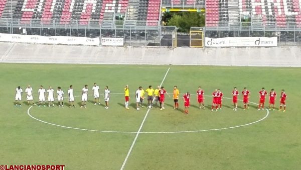 Nel primo quarto d’ora è il Lanciano a fare maggiormente la partita. Il pressing del Penne costringe però i rossoneri a rinunciare al fraseggio fin sotto porta, che aveva contraddistinto le amichevoli con Virtus Rocca San Giovanni e Miglianico. Perciò i padroni di casa si affidano spesso a lanci che scavalcano il centrocampo.